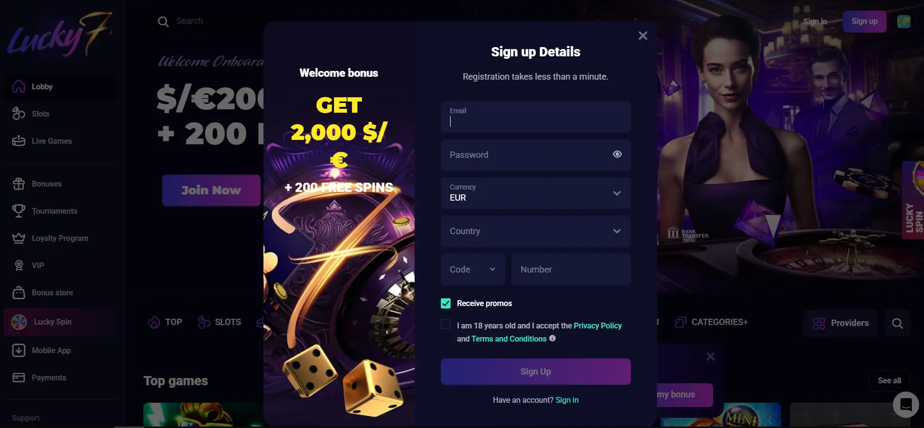 Getting started at Lucky7even is refreshingly simple. Registration takes just a few moments—enter your email, create a secure password, select your currency (EUR, USD, CAD, AUD, NZD, NOK, PLN, RUB, JPY, ZAR, INR, BRL, or major cryptos like BTC, ETH, LTC), and confirm your details. Thanks to modern encryption and privacy protocols, your information is always protected.